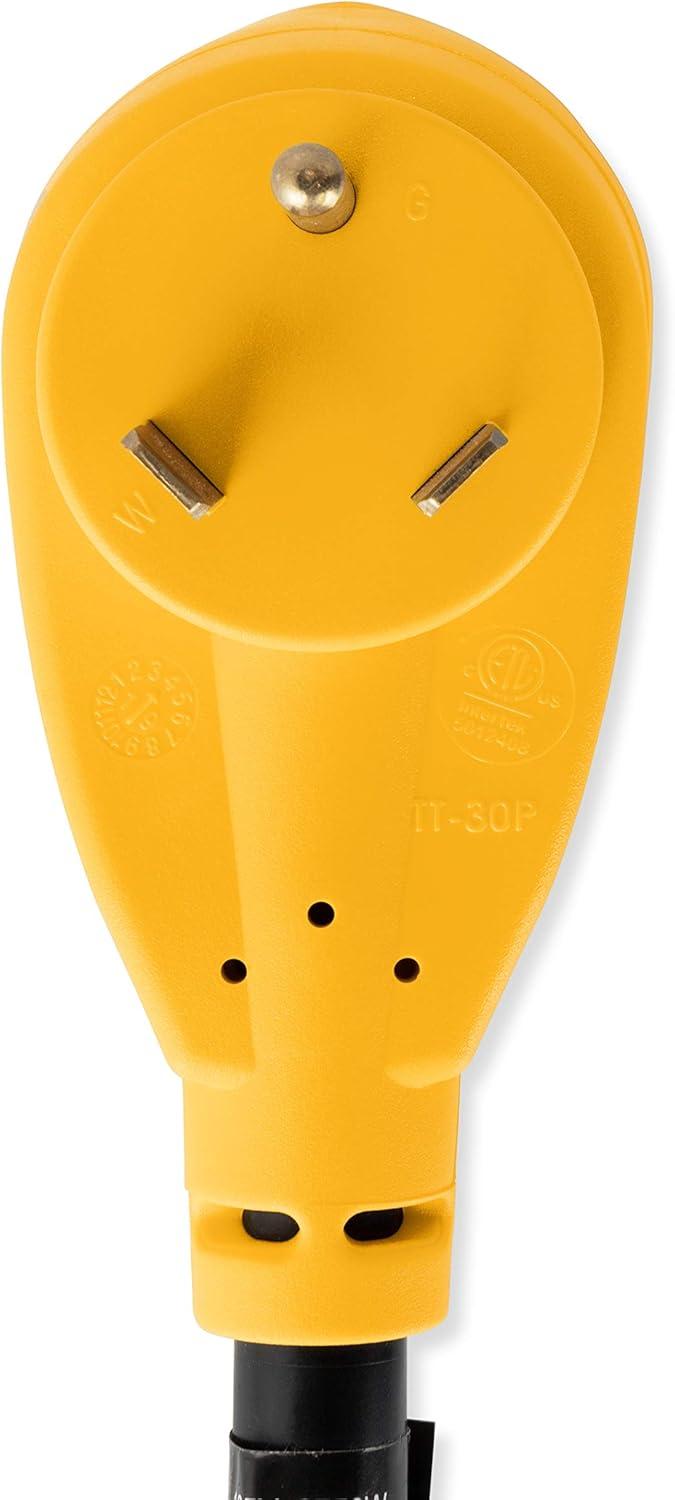 High Conductivity: Heavy-duty 30-amp male (NEMA TT-30P) and 15-amp female (NEMA 5-15R) electrical heads. Rated for 125 volts/1875 watts. Constructed with 100% copper, 10/3-gauge wires for superior conductivity