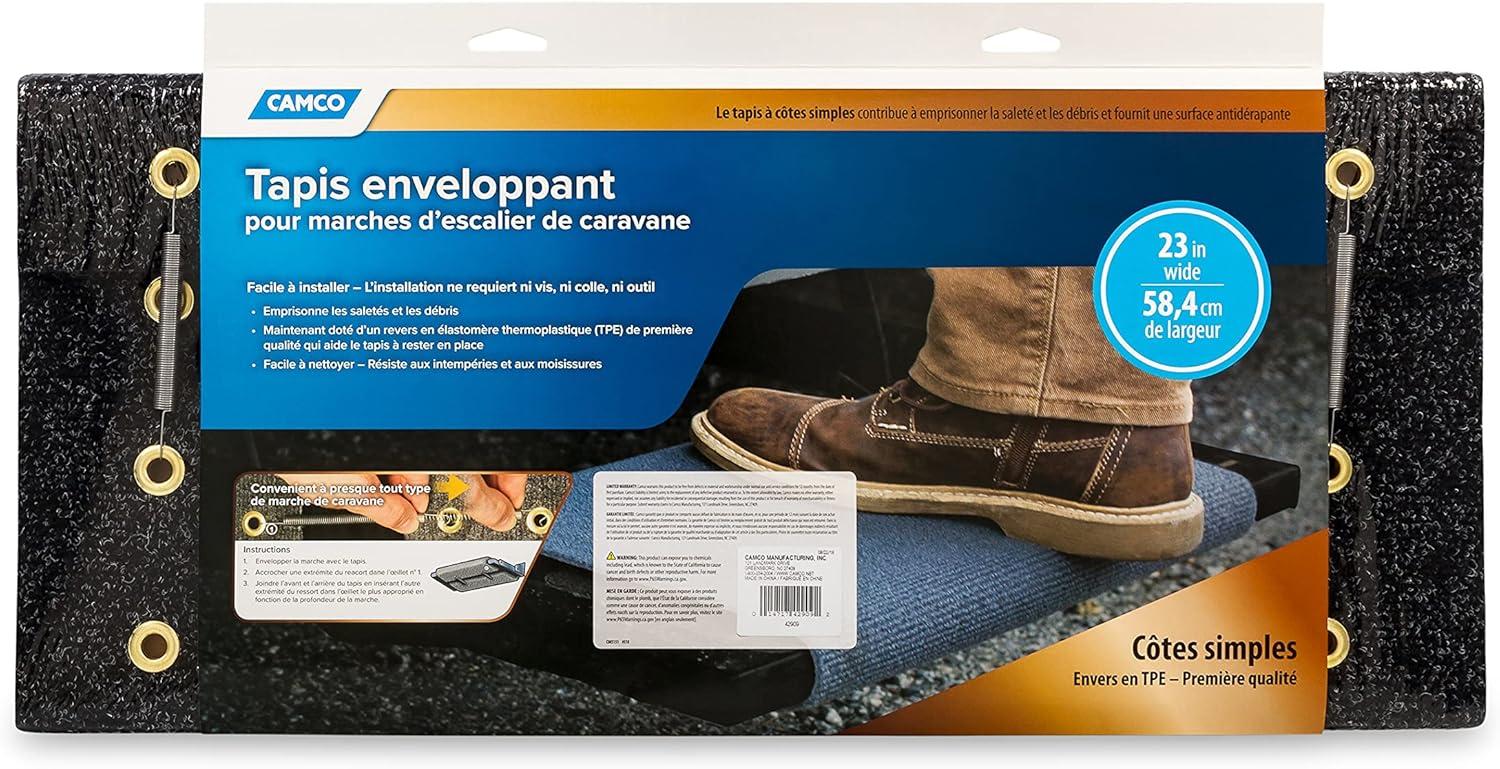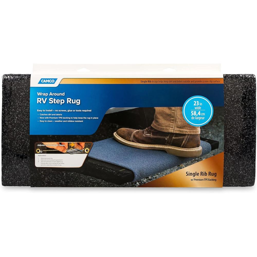 The Camco Premium Wrap Around Step Rug helps trap dirt. The improved TPE backing provides more grip between the rug and the step, keeping the rug in place and making sure it doesn't slip around the step. The Wrap Around Rug is easy to install with included springs-no screws, glue or tools required. It is weather resilient, making it easy to clean. Rug measures 22″ x 23″.