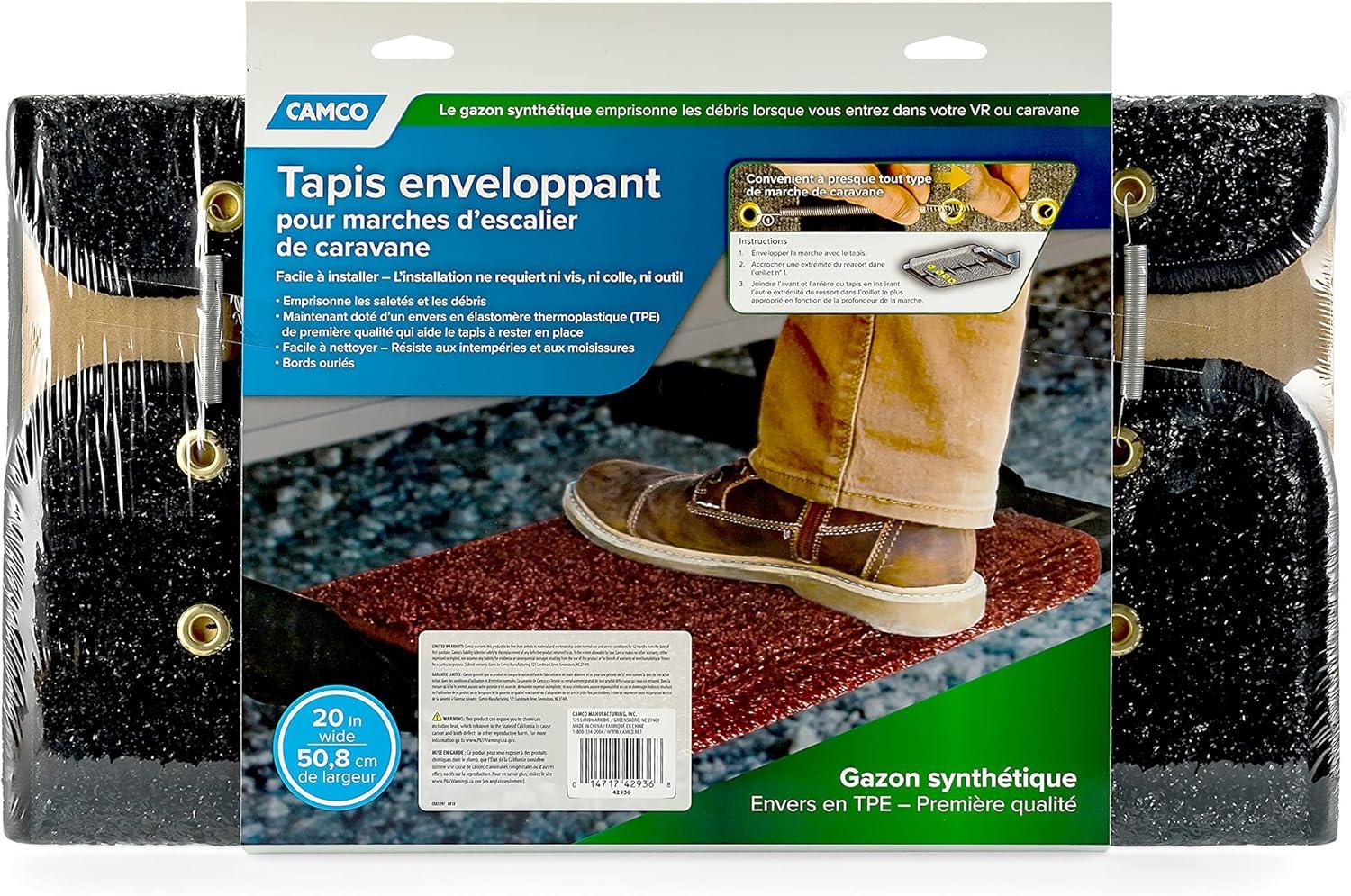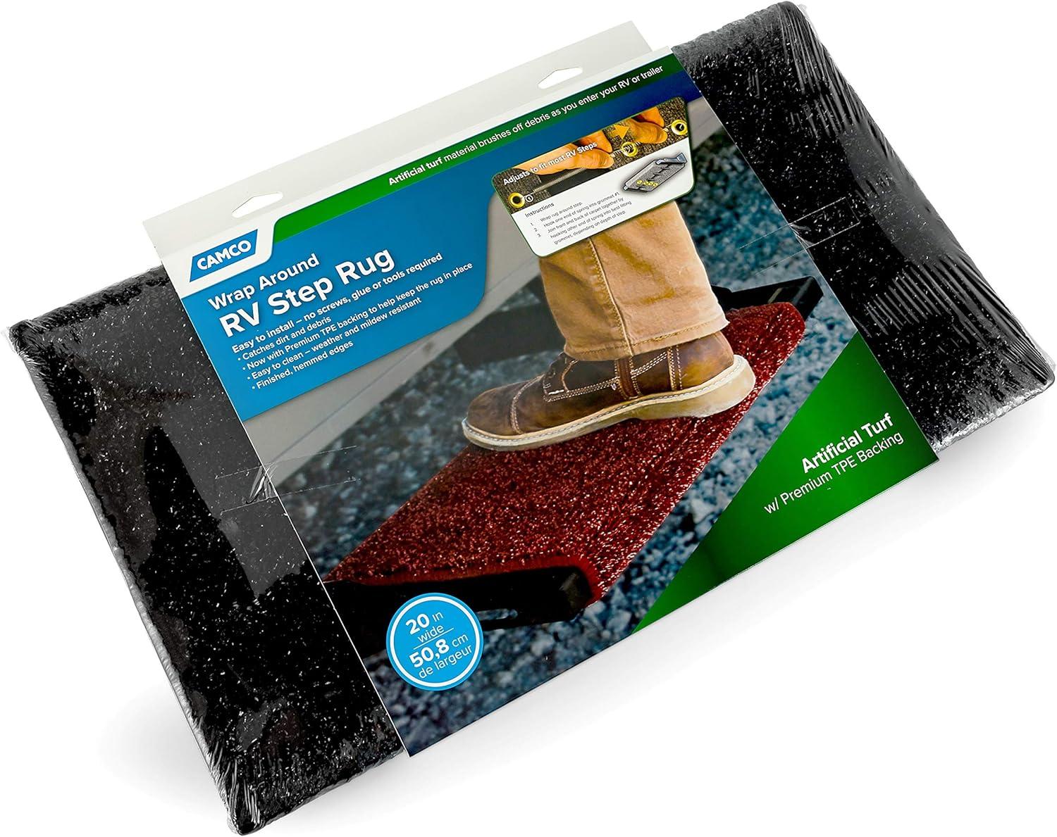 The Camco Wrap Around Turf Rug is made of artificial turf which dries quickly and helps trap dirt, leaves, etc. The improved TPE backing provides more grip between the rug and the step, keeping the rug in place and making sure it doesn't slip around the step. The Wrap Around Rug is easy to install with included springs-no screws, glue or tools required. It stands against the elements, making it easy to clean. Rug measures 22″ x 23″.