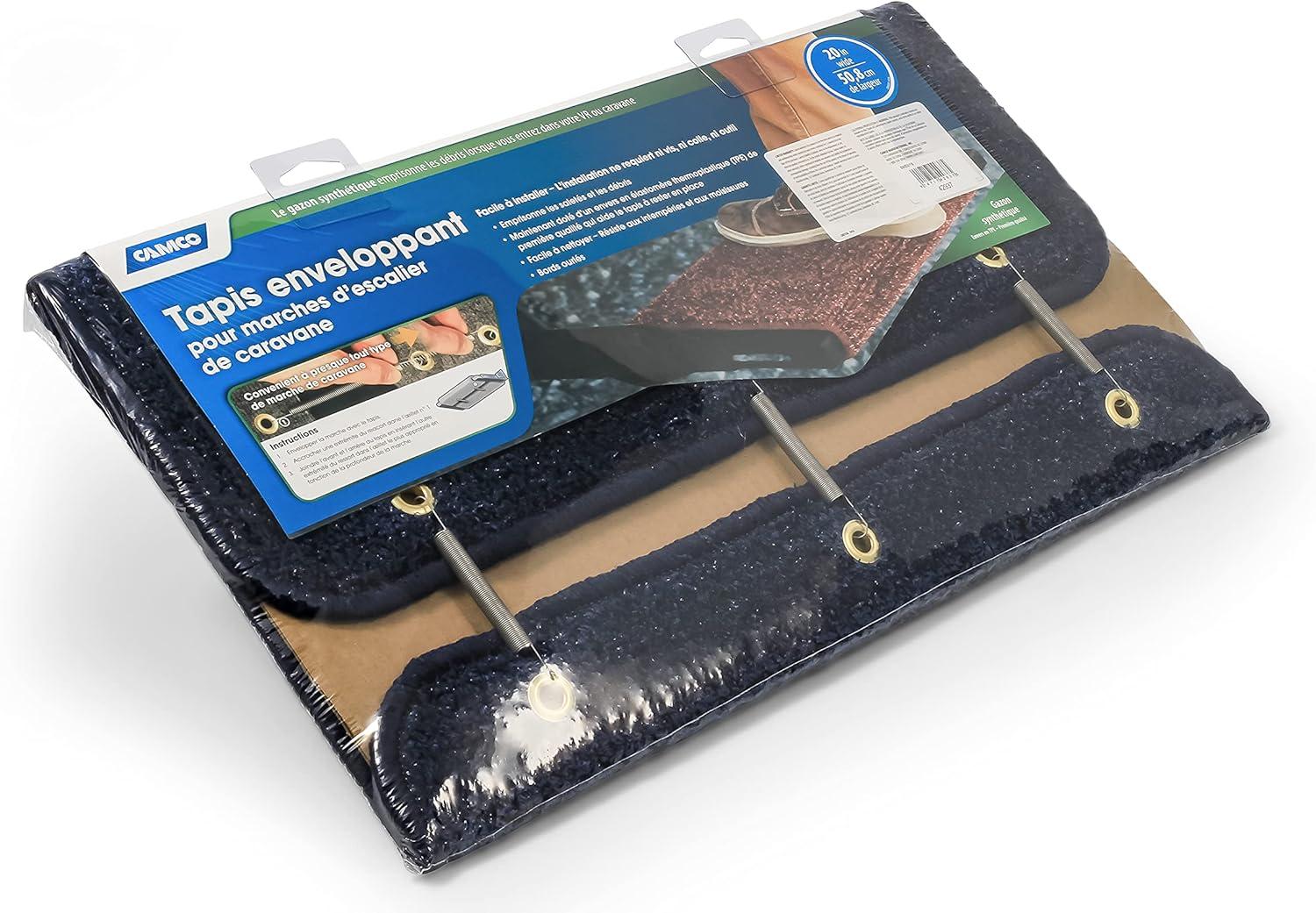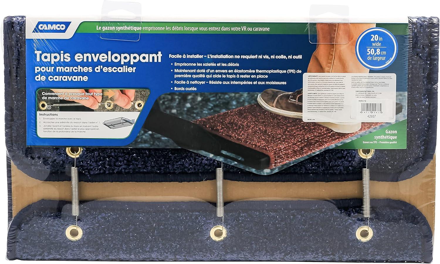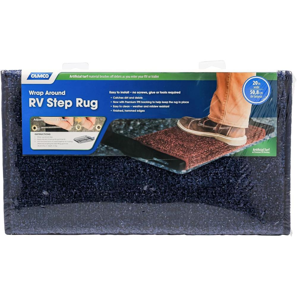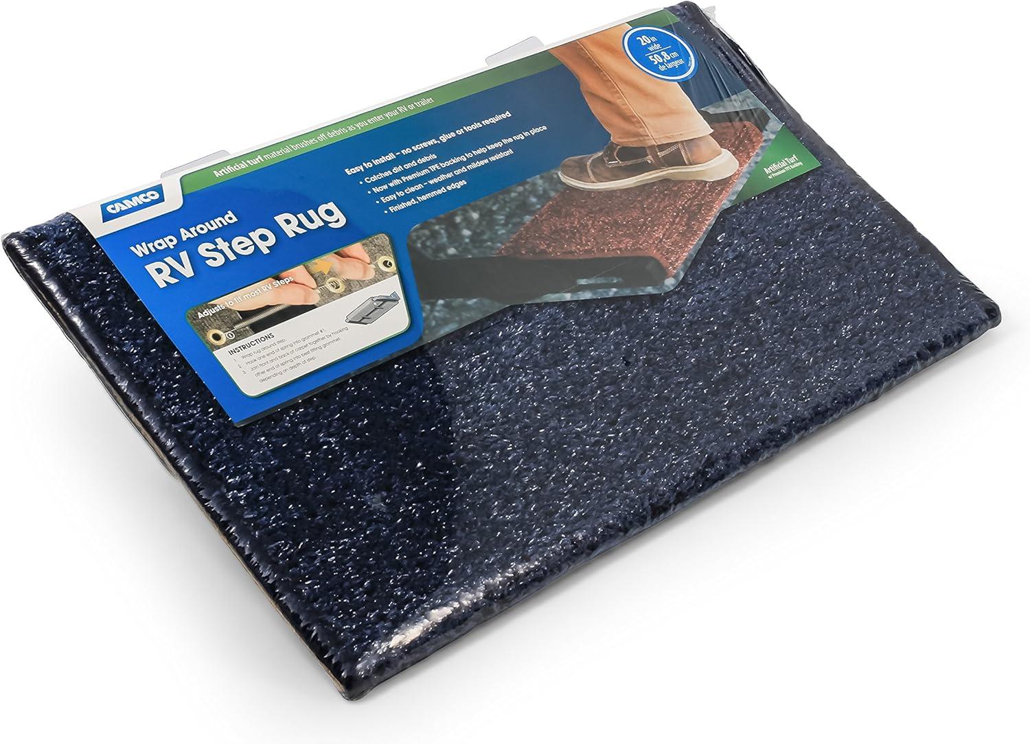 The Camco Wrap Around Turf Rug is made of artificial turf which dries quickly and helps trap dirt, leaves, etc. The improved TPE backing provides more grip between the rug and the step, keeping the rug in place and making sure it doesn't slip around the step. The Wrap Around Rug is easy to install with included springs-no screws, glue or tools required. It stands against the elements, making it easy to clean. Rug measures 22″ x 23″.