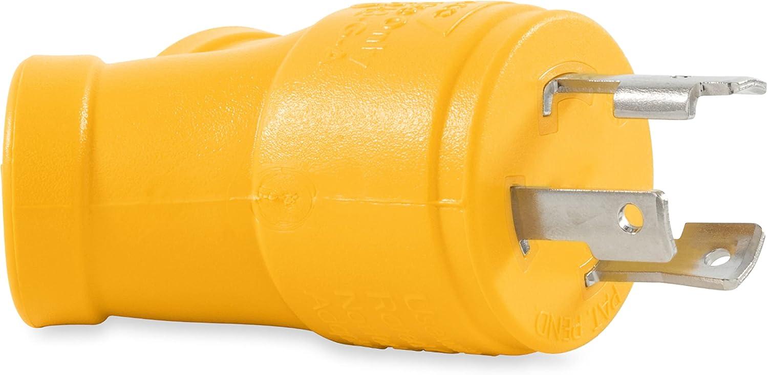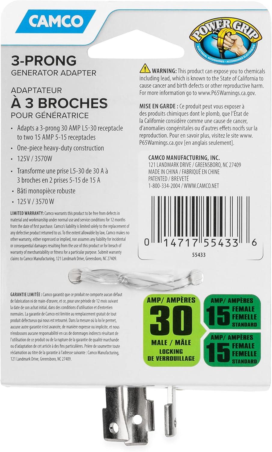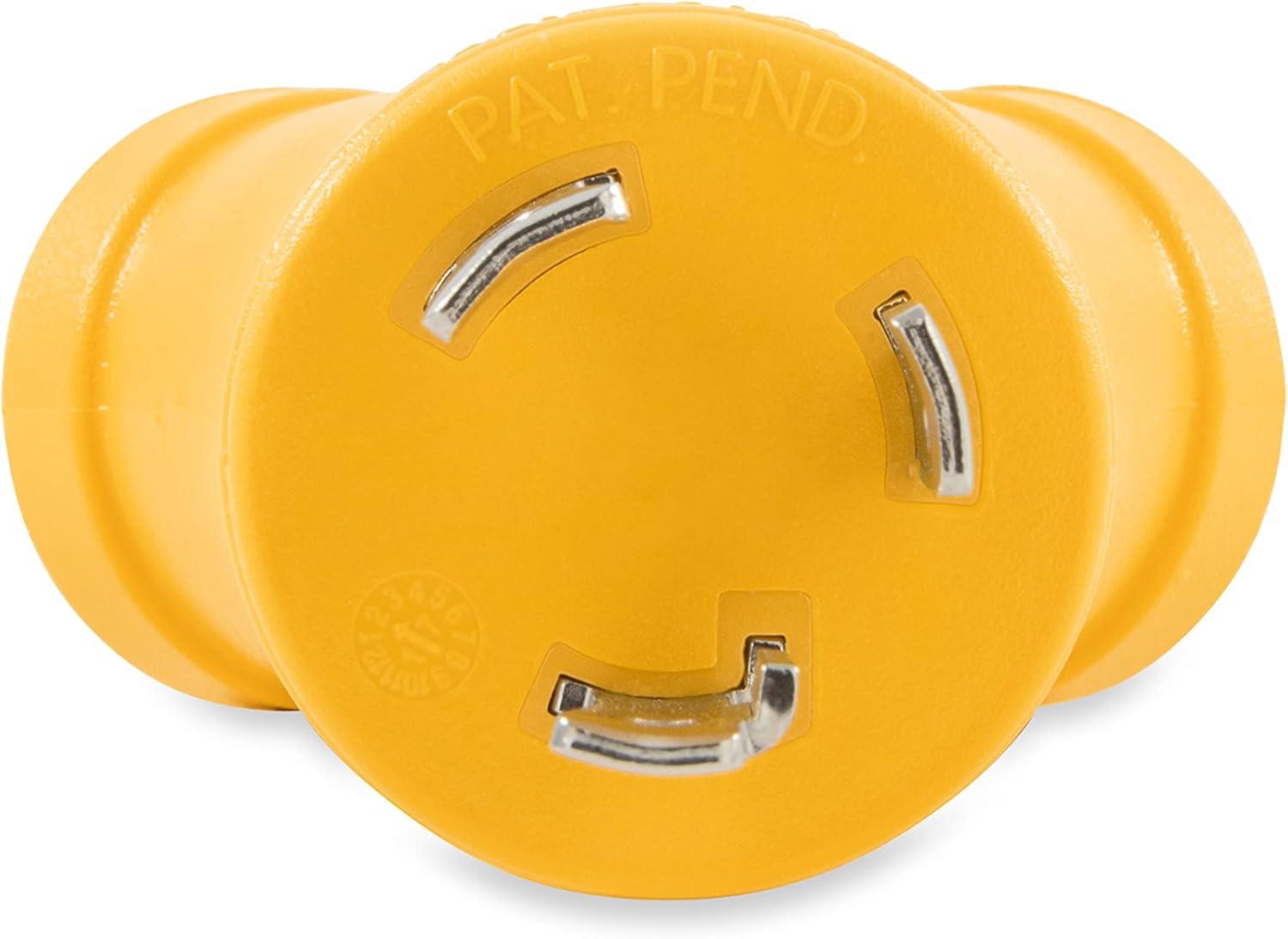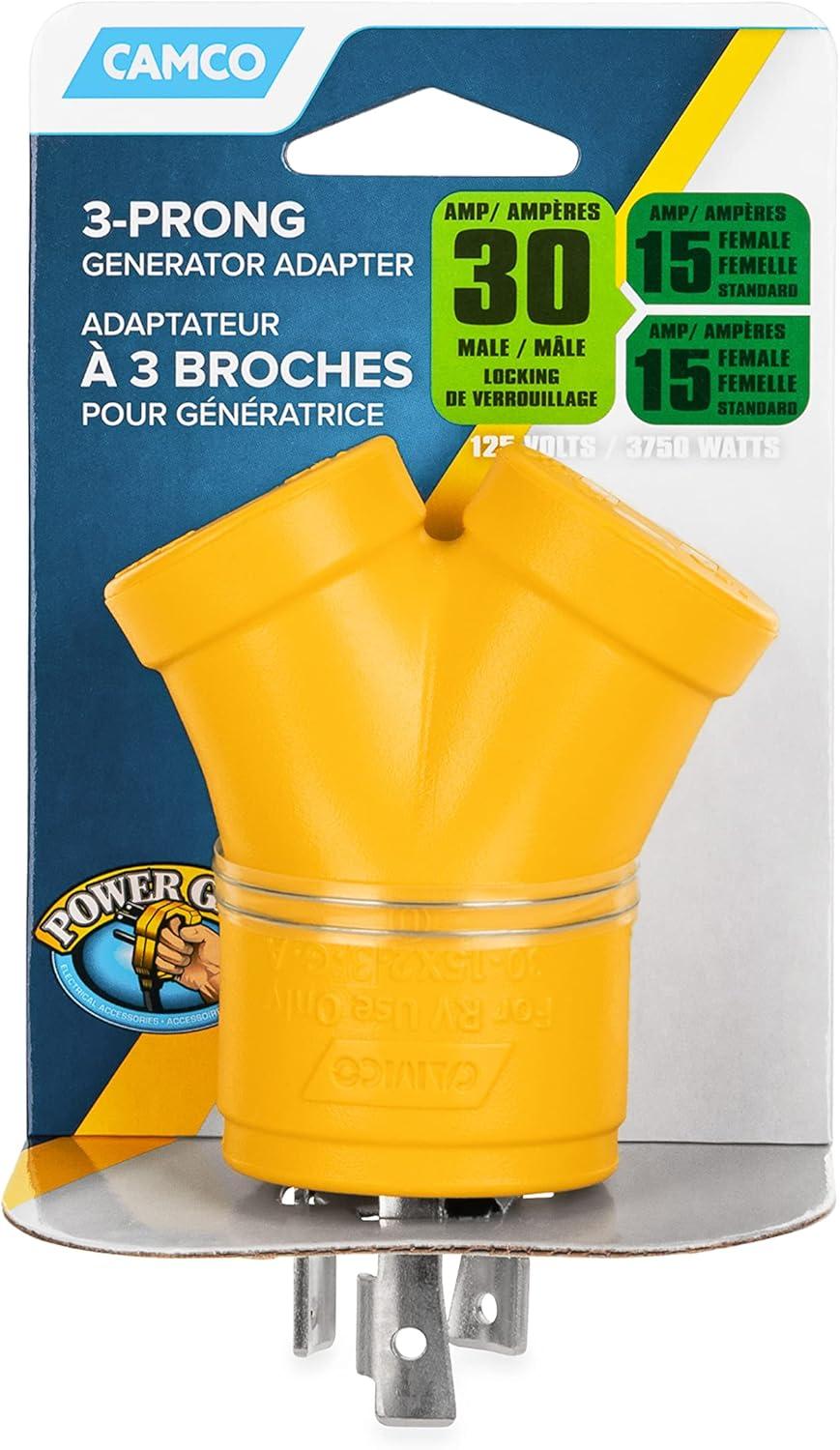 Camco's 4-Prong Generator Adapter allows you to easily and safely split one 30 AMP receptacle into two 15 AMP receptacles.