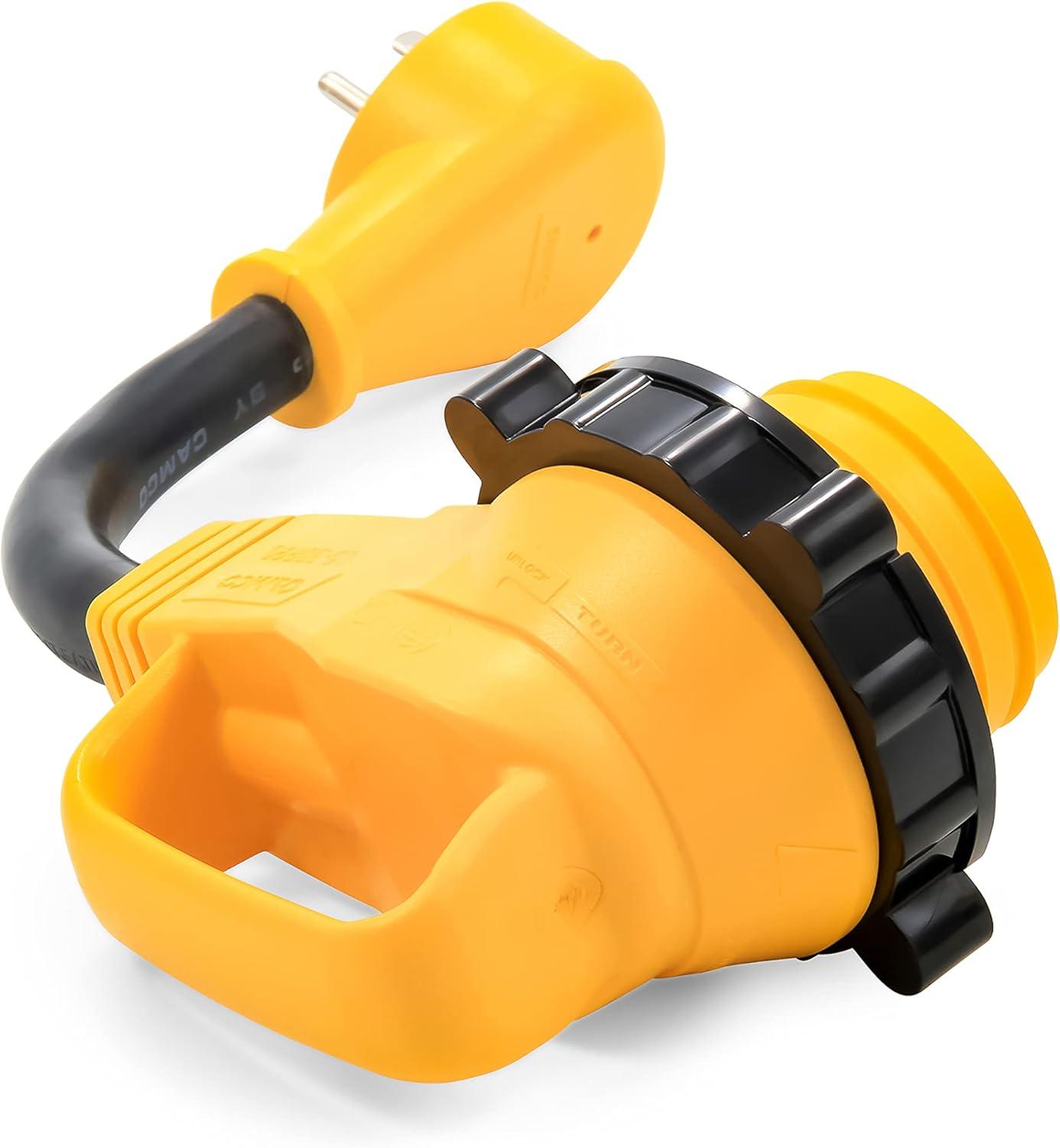 Camco 55636 Power Grip 12″ Dogbone with 90M/90F Locking Adapter – 15AM – 30AF, Yellow(One Size)