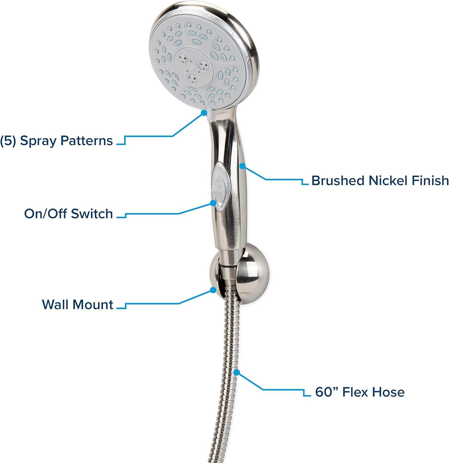 Camco's Complete RV/Marine Shower Head Kit allows you to enjoy water-efficient showers. A convenient on/off switch lets you to pause the flow of your shower to conserve potable water. The shower head features five spray patterns: rain shower (low), rain shower (high), massage with rain shower, massage spray, and pause/off. This complete kit includes: (1) shower head, (1) wall mount, (1) 60-inch flex hose, (2) screws and (2) wall anchors. Color: brushed nickel finish.