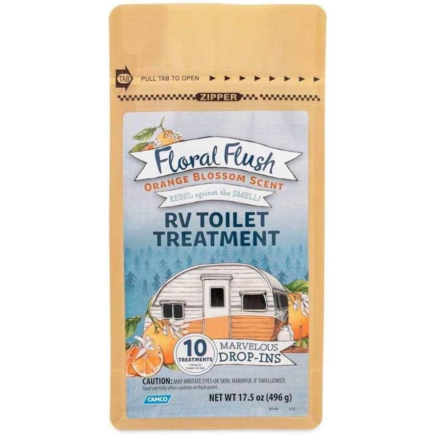 Floral Flush RV Toilet Treatment Drop-INs help control unwanted odors and break down waste and tissue in your RV waste holding tank or portable toilet. These easy-to-use Drop-INs have a blend of orange blossom-scented surfactant oils that trap unwanted odors in your tank, making your camping experience more enjoyable. They are septic safe, environmentally safe and biodegradable. The Drop-INs do not contain the toxic, formaldehyde-releasing ingredient bronopol. Comes in unique retro-style packaging that looks great in your RV bathroom. Each bag comes with (10) Drop-INs.