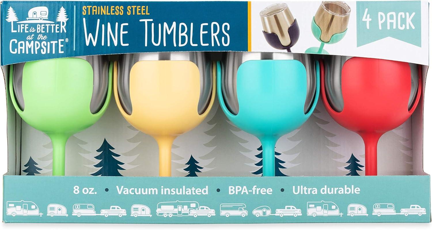 Make your next camping trip, tailgate, or party a hit with Camco’s Life is Better at the Campsite Wine Tumbler Set! These tough stainless steel wine glasses are a practical and stylish alternative to delicate wine glasses. With double walls for top-notch vacuum insulation, your drink will stay at the perfect temperature for hours. The flat bottom design allows for versatile use with or without the eye-catching stems that make it easy to identify your cup. Plus, BPA-free lids ensure beverages stay sealed. This set includes (4) 8 oz wine tumblers in green, yellow, blue, and pink. Standing at 7″ tall with the stem, these insulated wine glasses are great for any occasion. Just remember to hand wash them and avoid freezing or microwaving. Elevate your next adventure with the Camco Life is Better at the Campsite Wine Tumbler Set and create unforgettable memories!