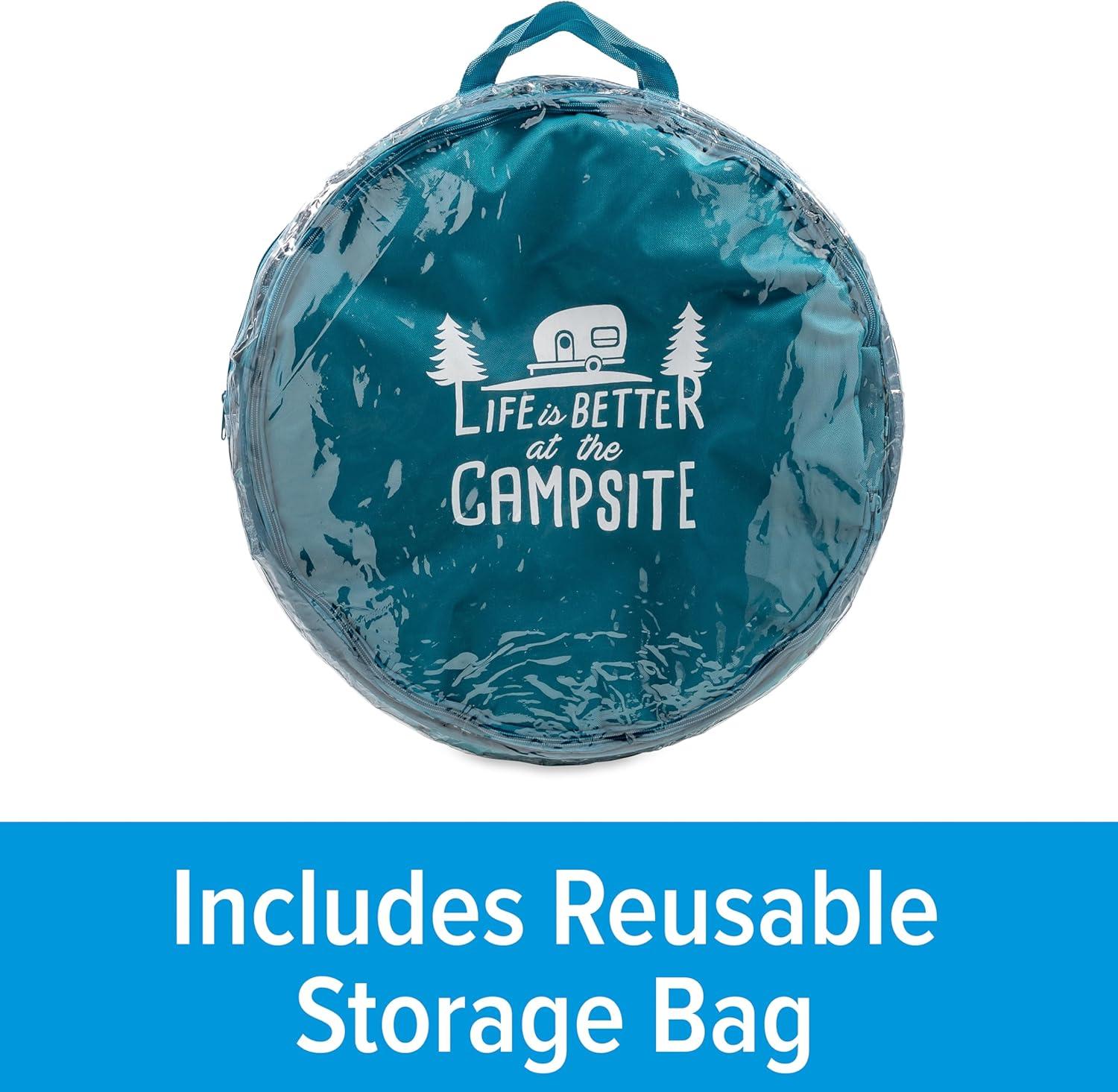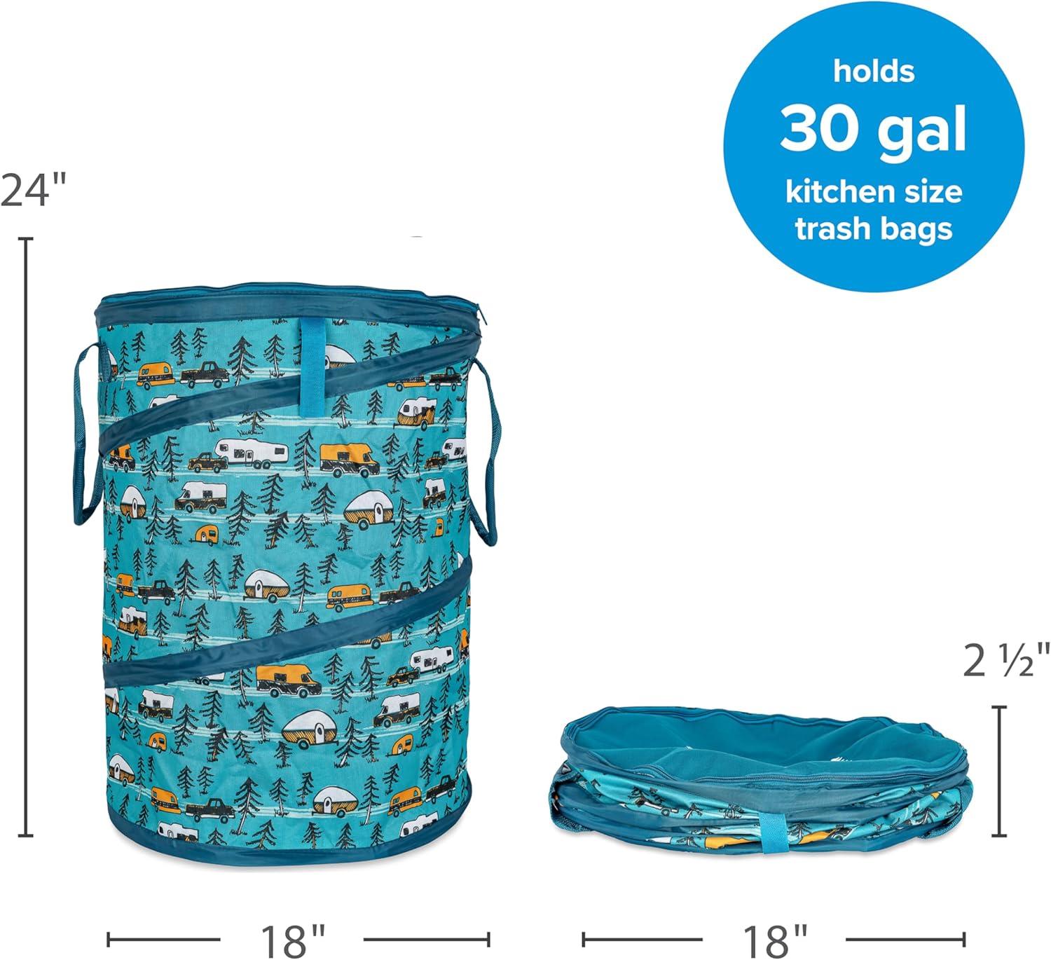 Elevate your outdoor adventures with the Camco Life is Better at the Campsite Pop-Up Container! This unique container expands from a compact 2 ½” tall to an impressive 24″ for abundant storage space. It easily fits 30-gallon trash bags with its spacious 18″ diameter. Made of fabric with a PVC inner liner for added durability, this tear-resistant container includes a zippered lid and padded handles. It even comes with a ground anchor for stability and a reusable storage bag. With its charming camping-themed design, this container adds a touch of fun and style to your outdoor experience. Whether you're RVing, camping, picnicking, boating, or tailgating, this collapsible bin is an ideal storage solution, allowing you to enjoy the outdoors in-style, without the clutter.