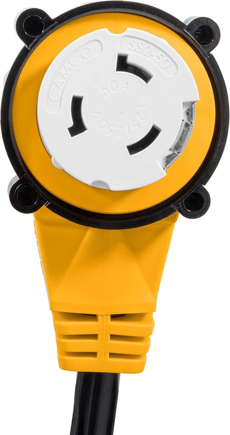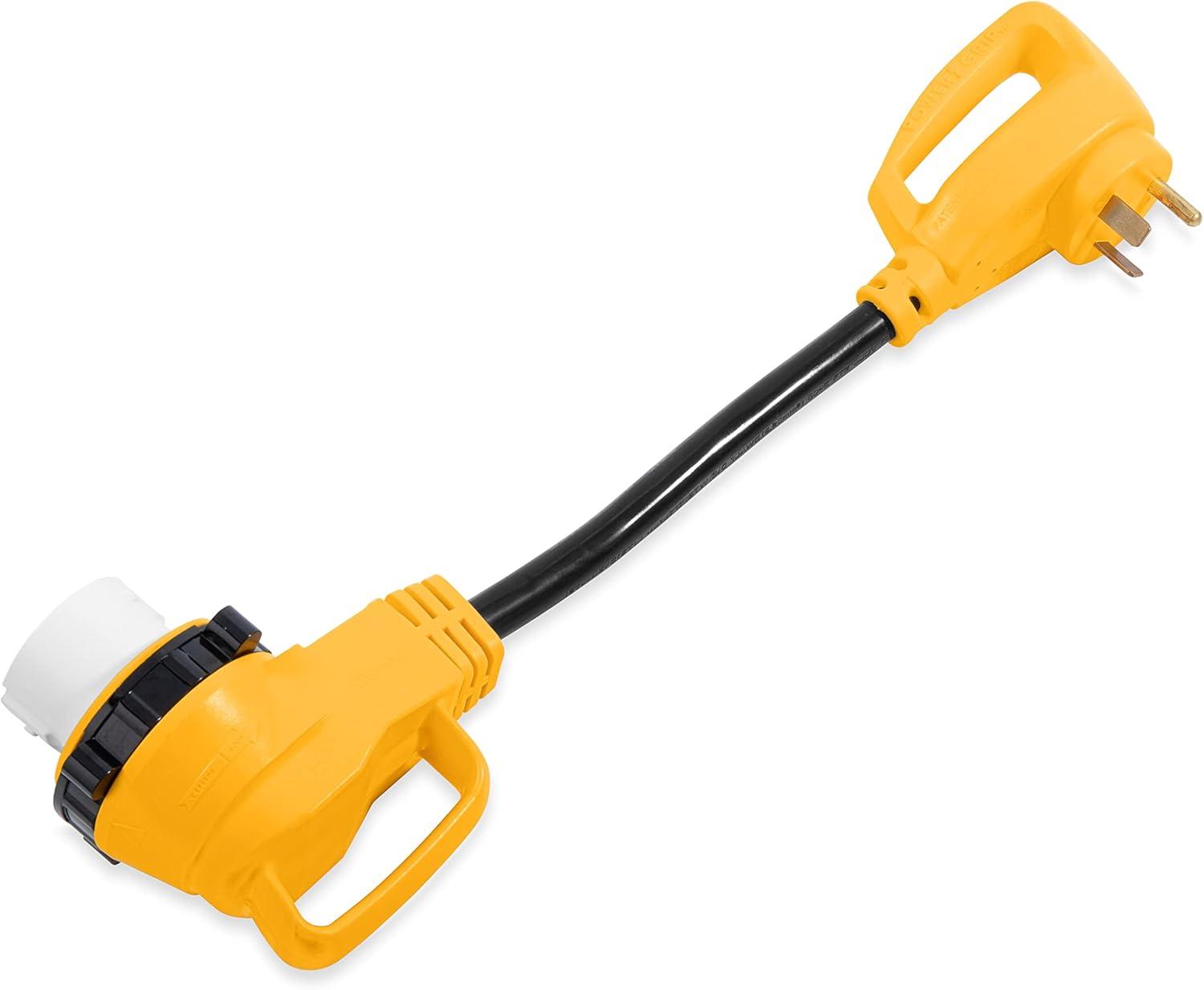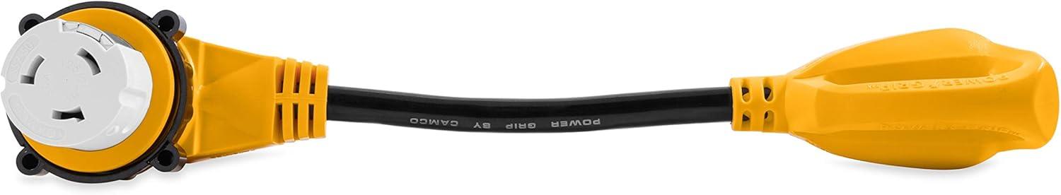 Hook your marine-style 50-amp RV power inlet to a standard 30-amp power source with Camco's Power Grip 18-inch locking adapter. 90-degree heads reduce strain on the RV connection and allow easier connection in tight places. Simply lock the 50-amp head onto the power inlet of the RV and connect the 30-amp plug to a standard 30-amp power cord. The threaded locking ring helps to create a weatherproof connection. Patented.