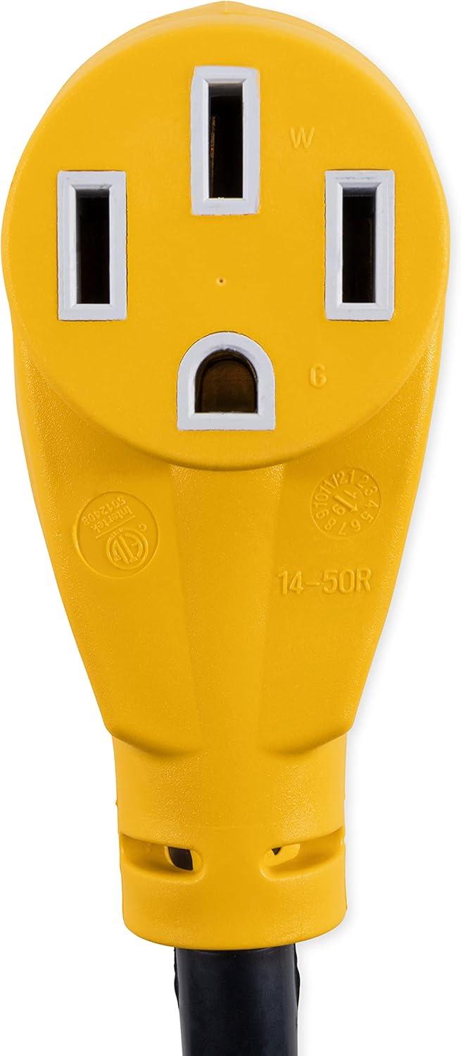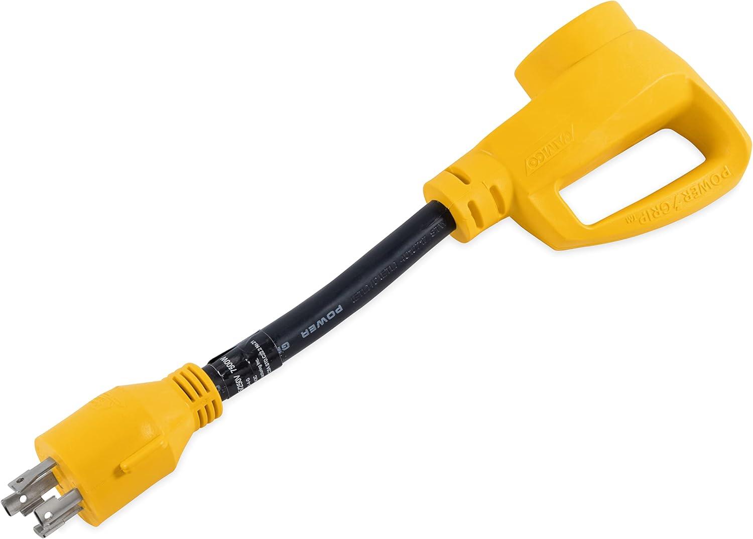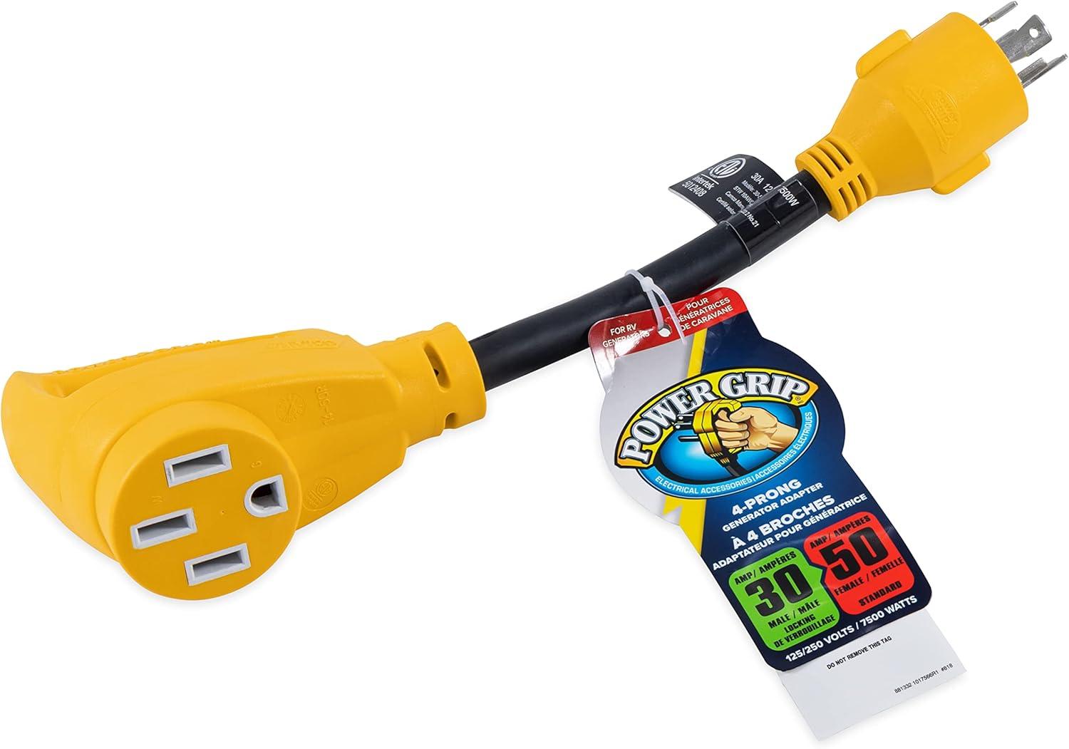 Camco's 12″ RV PowerGrip Generator Adapter connects a generator with a L14-30 locking plug receptacle to a recreational vehicle that uses a standard 50 AMP RV cord set. It features the patented PowerGrip handle for ease of use and is rated for 7500 Watts, 125/250V. The adapter's male end is a four prong L14-30 and female end is standard 50 AMP.