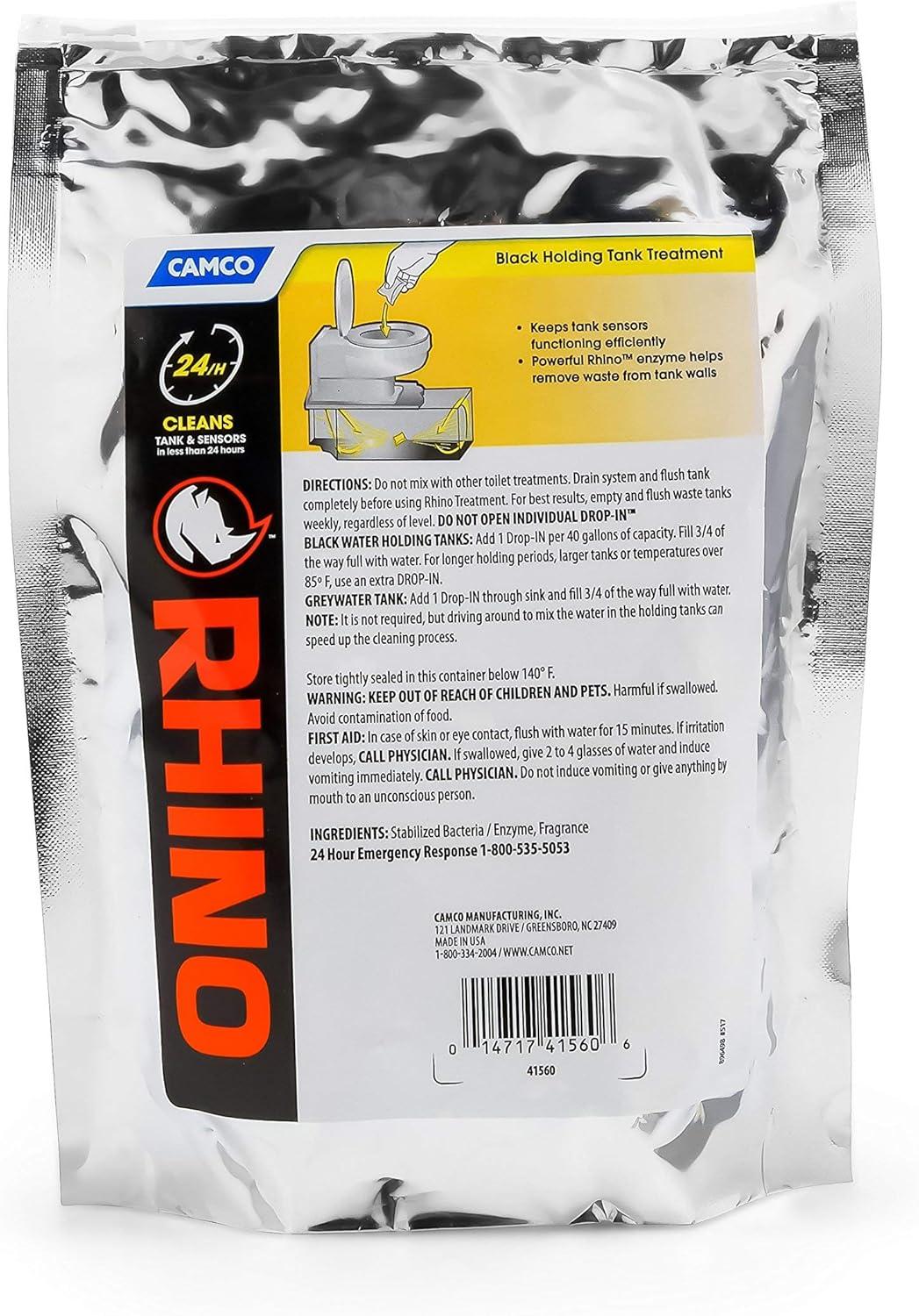 Camco's RhinoFLEX Premium Enzyme RV Holding Tank Treatment Drop-INs contain an enzyme complex that digests waste, tissue, fats and proteins. This treatment activates when it hits water. Just (1) Drop-IN treats up to 40-gallons and stops odors for up to 7 days. This product contains a buffer system to stop acid formation as well as septic odors. All components are biodegradable, septic safe and do not contain harmful formaldehyde, pesticides or biocides. Includes (10) Drop-INs. Fragrance: pine scent. Made proudly in the USA. Camco makes quality products for RVing, boating, camping, towing, tailgating, and grilling that help you take your passion for the outdoors to the next level.